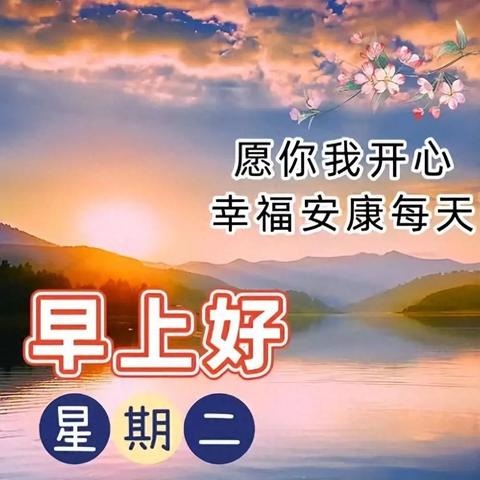 早上好,我为你带来清晨的第一缕阳光,愿你像阳光一样夺目耀人,我为你带来清晨的第一缕微风,愿你像微风一样怡人舒爽,朋友,早安!送你一朵吉祥花,年年健康有钱花;送你一杯吉祥酒,温馨甜蜜到永久;送你一轮吉祥月,天天出门有喜悦;送你一道吉祥符,好运伴你平安福!周二早安!**